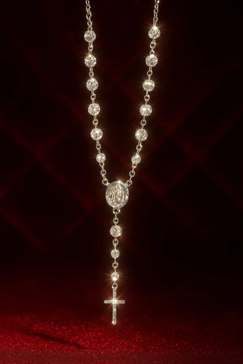 Los rosarios diamantados se han convertido en una tendencia por su brillo, peso equilibrado y estética moderna. Ideal para llevarlo al cuello, rezar o conservar como pieza espiritual personal.